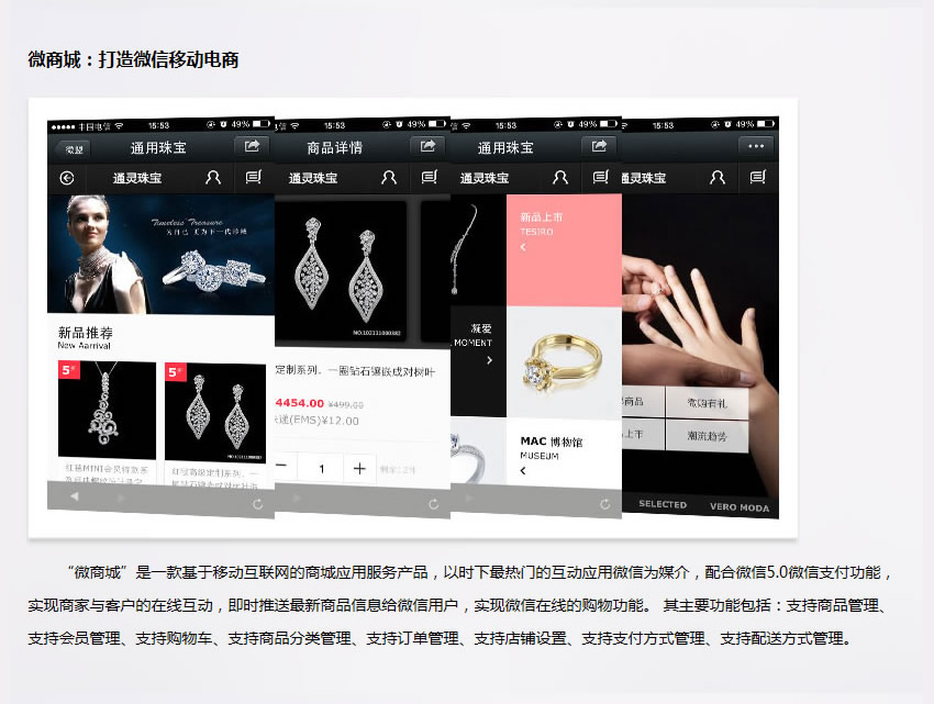 “微商城”以时下最热门的互动应用微信为媒介,配合微信5.0微信支付功能,实现商家与客户的在线互动,实现微信在线的购物功能。 其主要功能包括:支持商品管理、会员管理、购物车、订单管理、支付管理、配送方式管理。