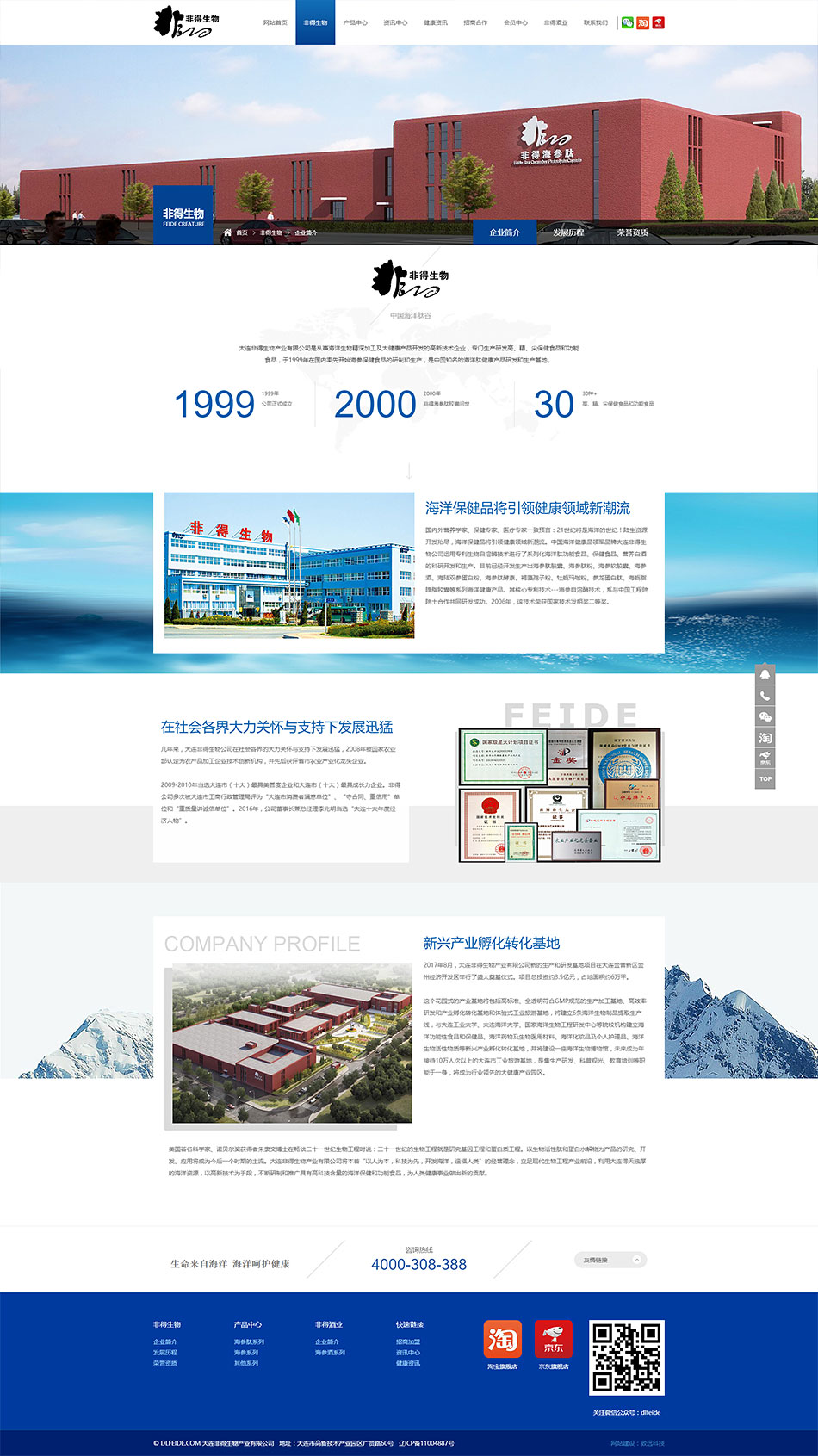 大连非得生物产业有限公司是从事海洋生物精深加工及大健康产品开发的高新技术企业,专门生产研发高、精、尖保健食品和功能食品,于1999年在国内率先开始海参保健食品的研制和生产,是中国知名的海洋肽健康产品研发和生产基地。